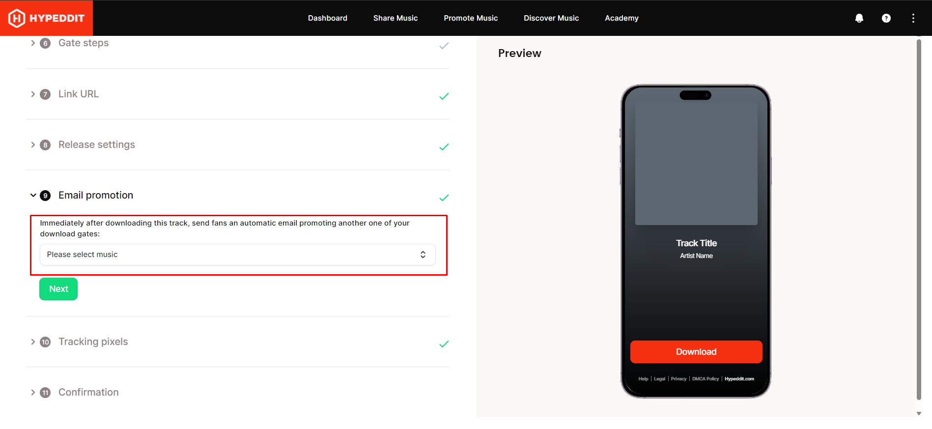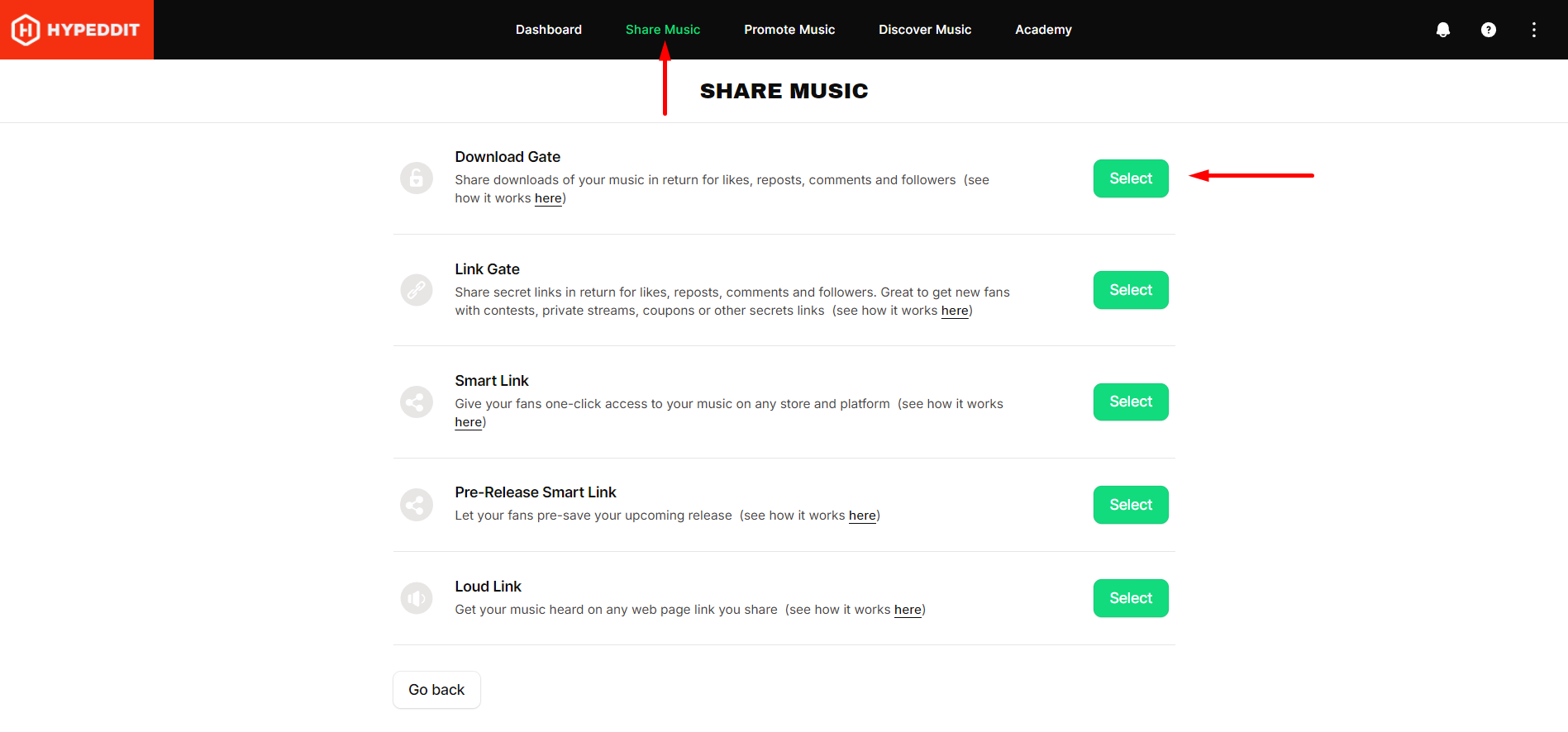 Step 1. On your Hypeddit Dashboard, click on "Share Music" in the top navigation. Then, click on the green "Select" button next to the "Download Gates" option.