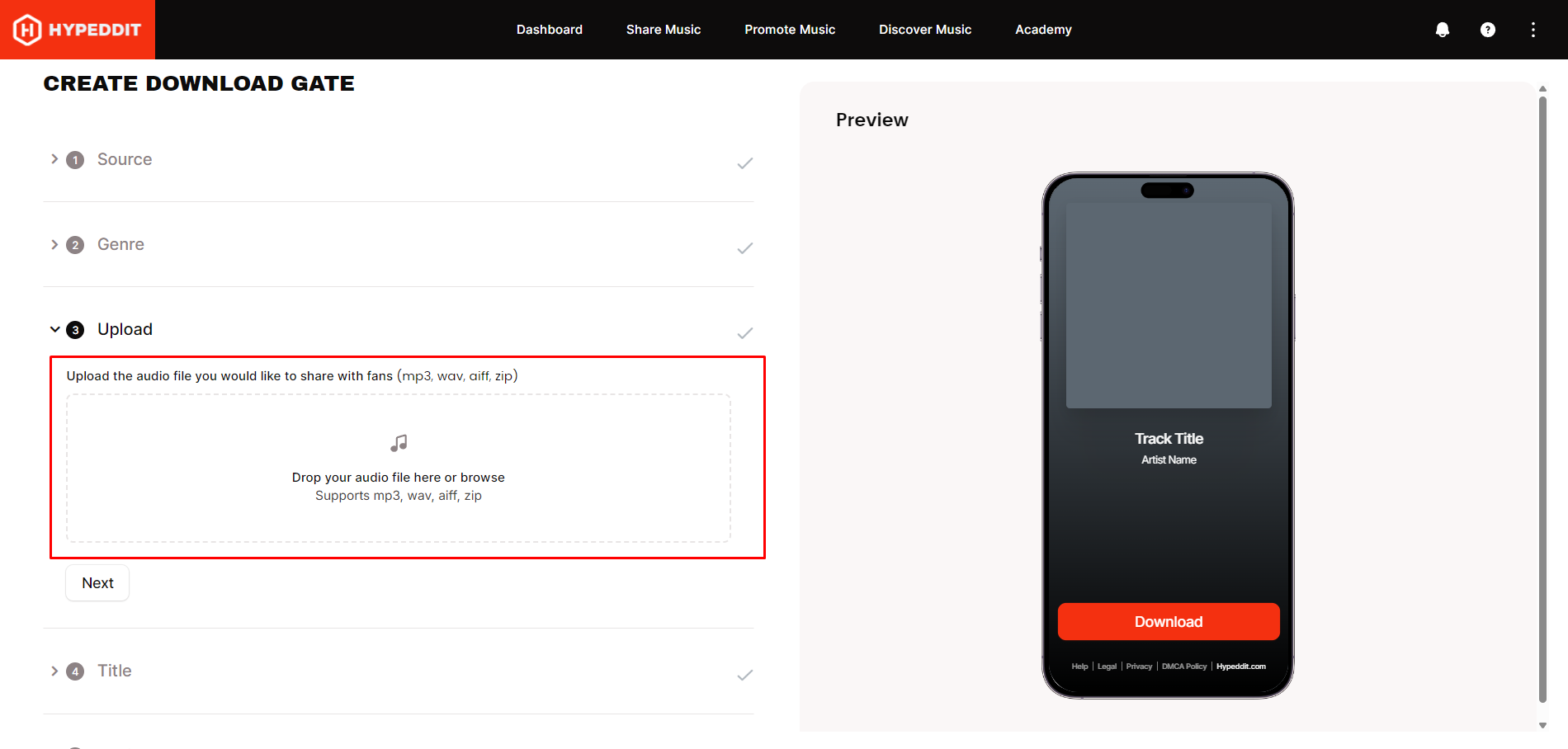 Step 4. Upload the audio file you want to share with Fans as a free download. This could be the same audio file that you have on SoundCloud, YouTube, Spotify, or MixCloud, but it can also be a different file.