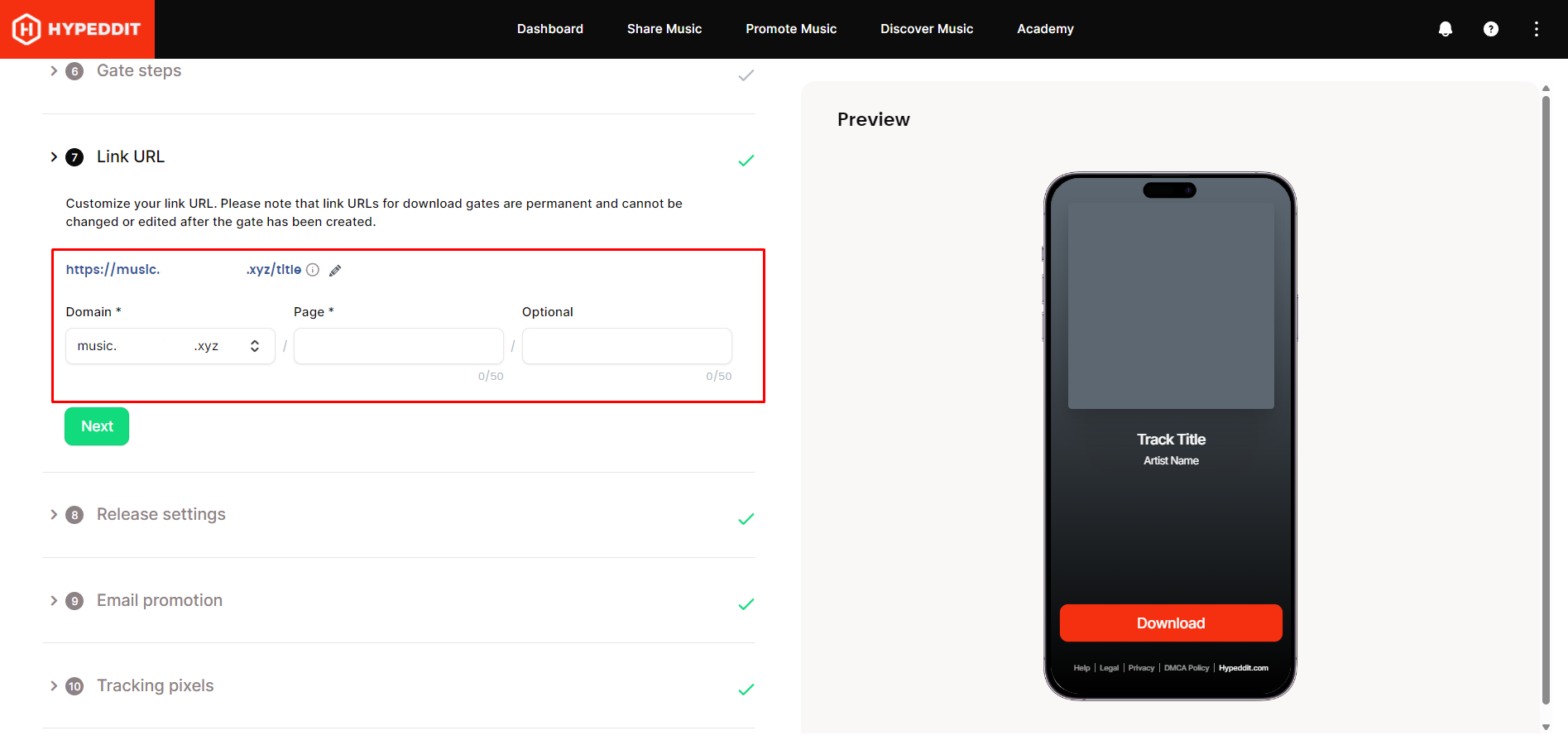 Step 8. Then, set up your Custom Link URL or use the default Hypeddit URL. To learn more about Custom Link URLs, click HERE