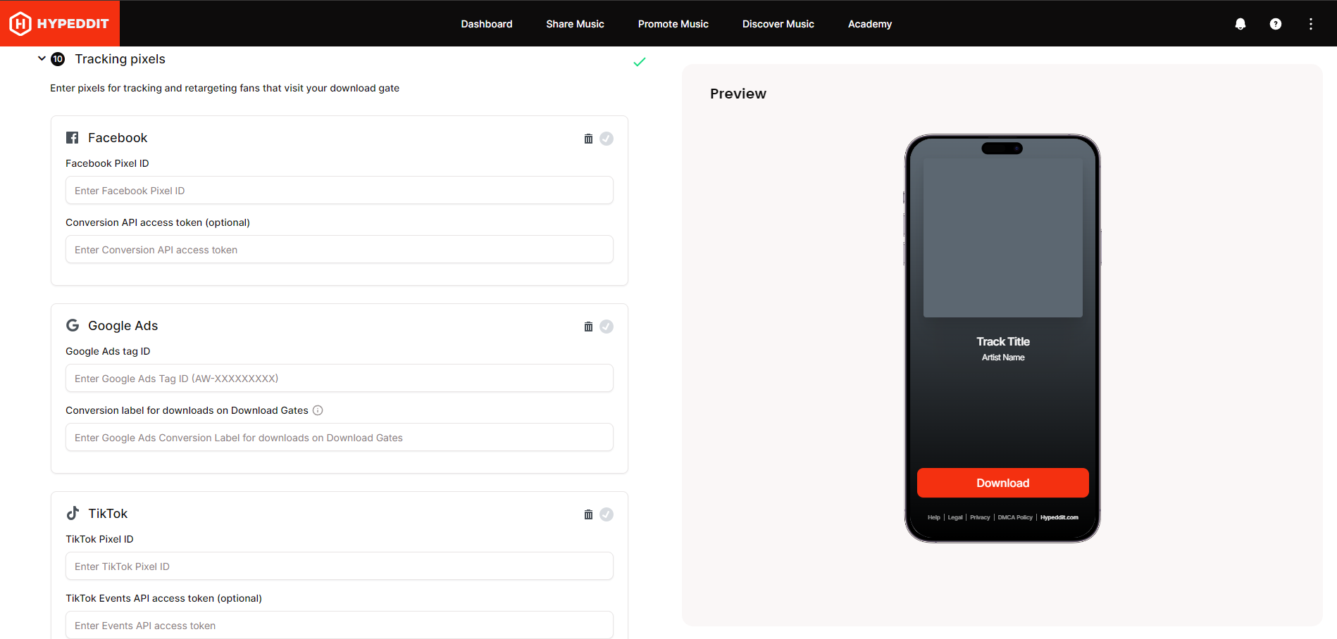 Step 11. You can add your Tracking Pixels for various ad platforms to your Download Gate. Hypeddit lets you manually enter your Tracking Pixels or save them to your account (Learn More) for easy access on future Download Gates.