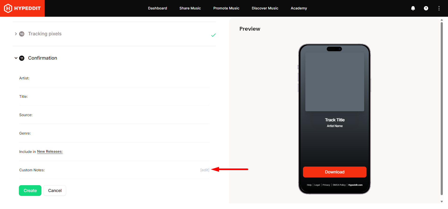 Step 12. On the Confirmation step, you can check the information you just entered and add "Custom Notes" if needed, so you can easily identify your Download Gate among others on your Hypeddit Dashboard. Once done, click on "Create".