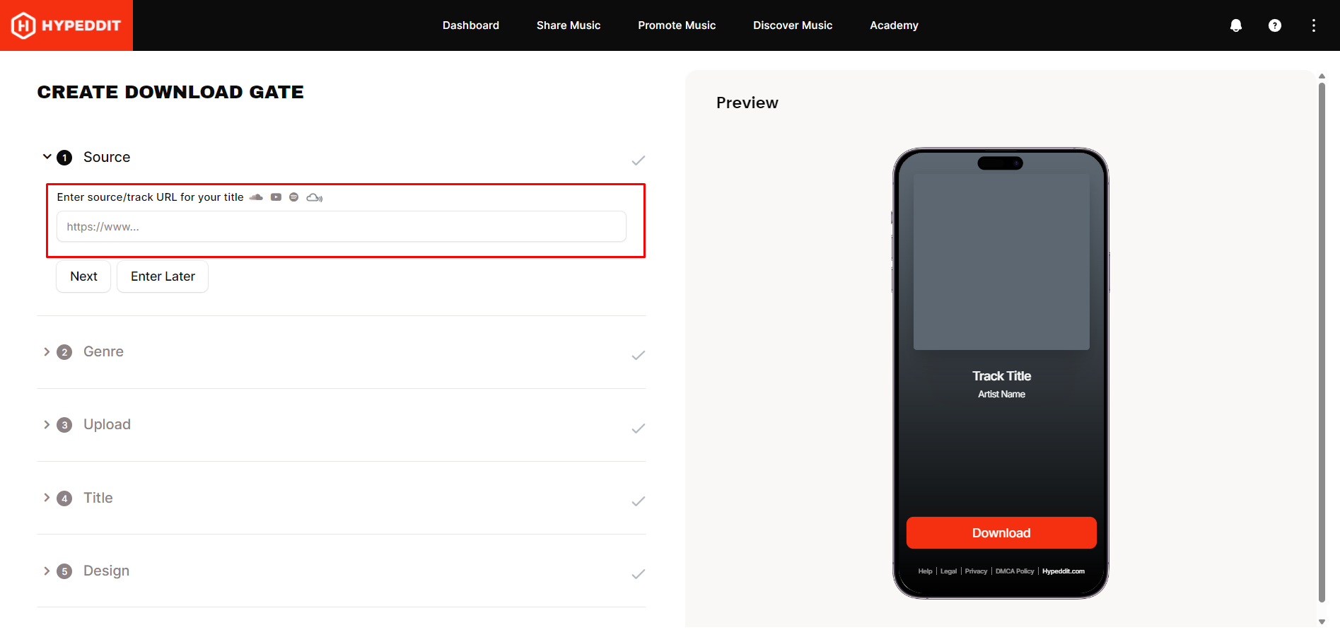 Step 2. Start setting up your Download Gate by entering the URL of your track on SoundCloud, YouTube, Spotify, or MixCloud.