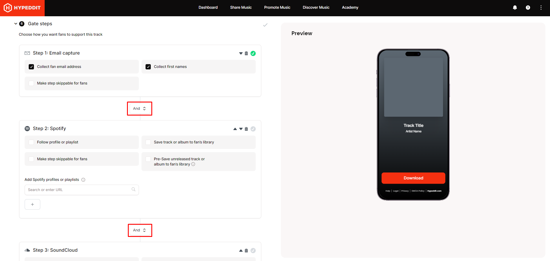 Step 7. Set up the Gate Steps. These are the steps you're asking fans to complete in order to unlock your download.
